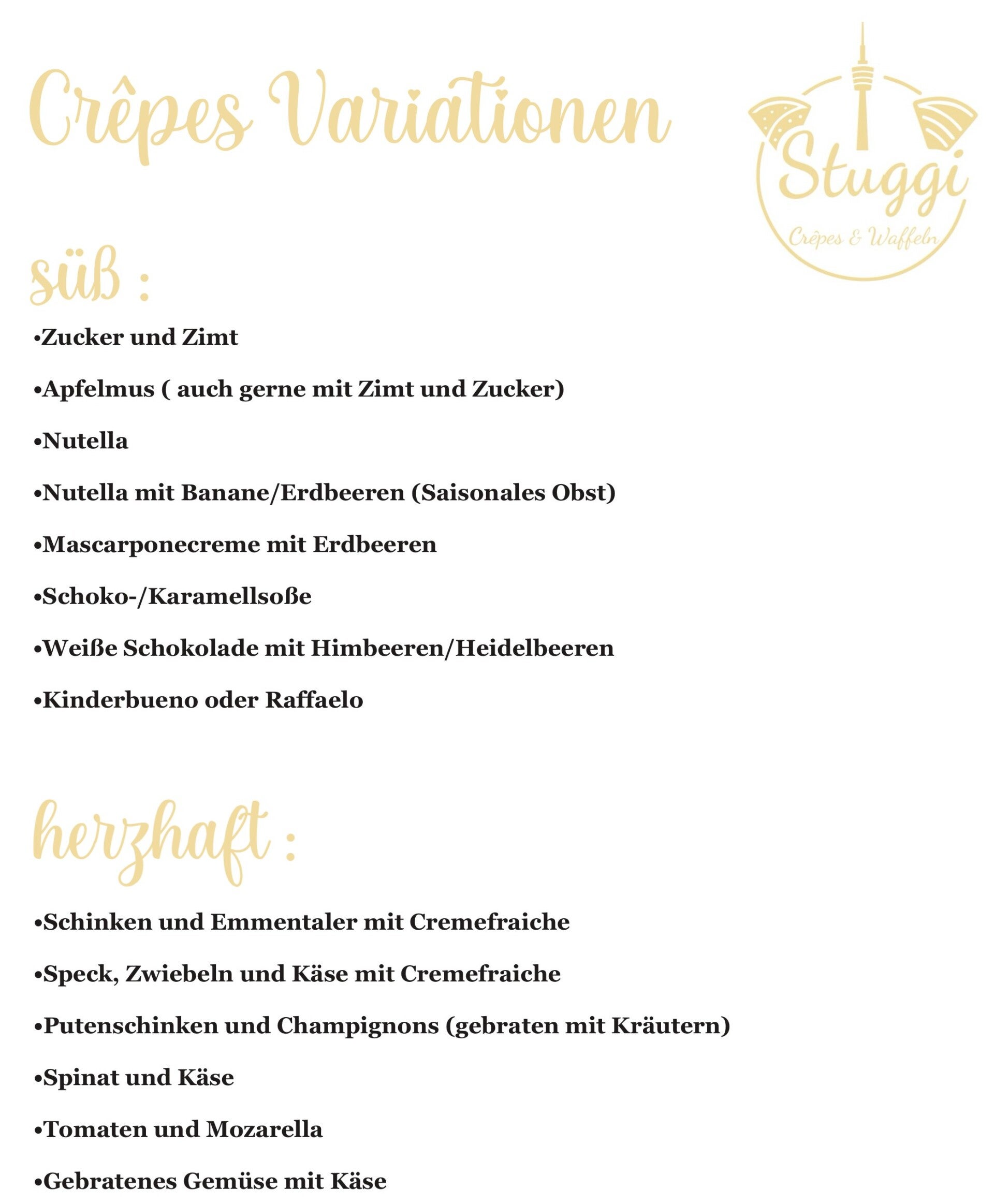 Willkommen bei Stuggi Crepês & Waffeln! Wir sind Ihr idealer Partner für Festivals, Straßenfeste, Märkte und Sportveranstaltungen. Entdecken Sie unsere köstlichen Crepês- und Waffelvariationen, die jedes Event bereichern. Wir freuen uns darauf, Sie mit unseren regionalen Spezialitäten zu verwöhnen!